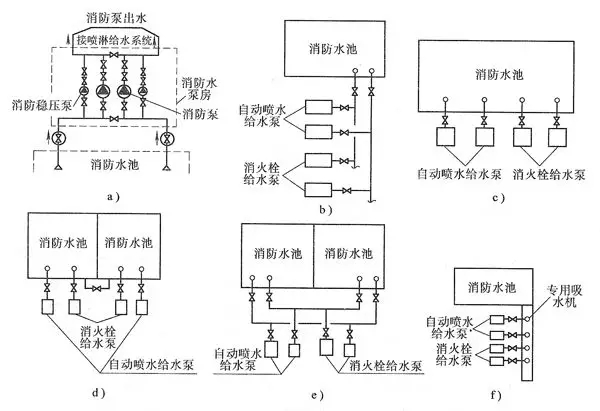 (2)高壓或臨時(shí)高壓消防給水系統(tǒng),其每臺消防泵(工作水泵和備用泵)應(yīng)有獨(dú)立的吸水管。從消防水池(或市政管網(wǎng))直接取水,保證供應(yīng)火場用水。